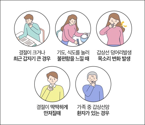 갑상선 결절이 점점 커질수록 목 주변에 압박을 받게 되면서 식도가 눌려 음식물을 삼키기 힘든 상황도 생기고 기도가 눌려서 호흡 곤란 증상이 나타날 수도 있습니다. 대부분의 사람들이 목에 통증이 있다면 목감기나 기침감기로 생각하는 경우가 흔한데요 목의 통증이 시간이 흘러도 호전되지 않고 몇 주가 지나도 계속된다면 병원에 내원해서 검사를 받아보는 것이 좋습니다.