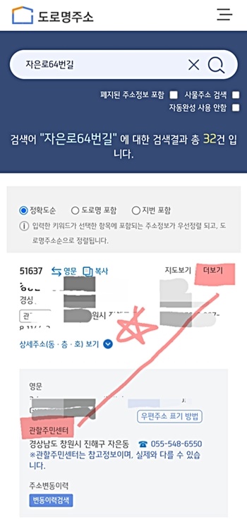 '도로명 주소 안내시스템' 홈페이지로 들어가시면 제일 먼저 나오는 검색창에 여러분이 사시는 곳의 주소를 적습니다. 그러면 아래에 결과가 나오는데 오른쪽으로 보시면 '더 보기'가 보입니다. 이 '더 보기'를 클릭하시면 그 아래로 '관할주민센터'가 영문 주소와 함께 표시가 됩니다.