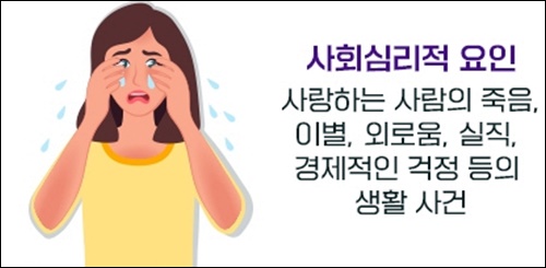 사랑하는 사람을 잃거나 재정적 고충, 관계 문제, 학대나 방임의 이력과 같은 외상성 생활 사건은 우울증을 유발하였거나 우울증에 기승 할 수 있습니다. 만성 스트레스, 꾸준한 갈등, 사회적 고립, 사회적 지원 부족도 정신 건강에 좌우 수 있습니다. 또한 환경 독소, 약물 남용 및 만성 질환에 대한 노출은 우울증 병이 발생 위험을 증가시킬 수 있습니다.