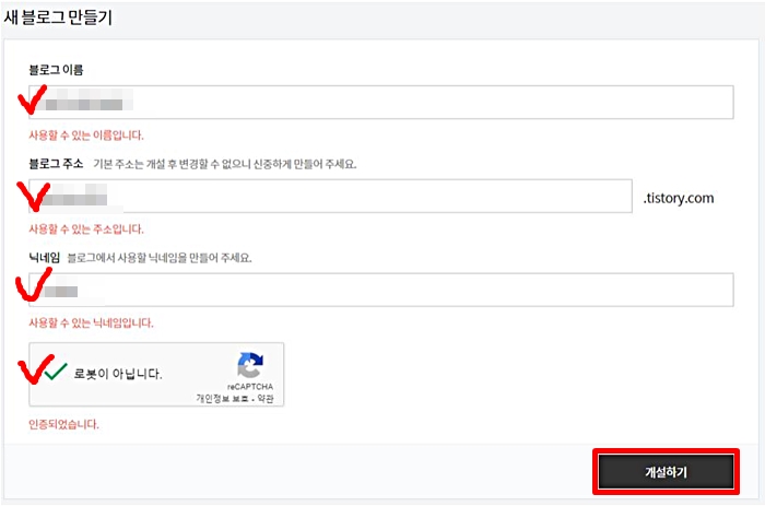 아래와 같이 블로그 이름, 블로그 주소, 닉네임을 적으신 후 '로봇이 아닙니다'에 체크합니다.