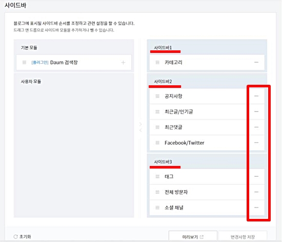 사이드바1을 제외한 사이드바2와 사이드바3에 있는 메뉴들 옆에 있는 - 빼기 버튼을 모두 눌러줍니다.