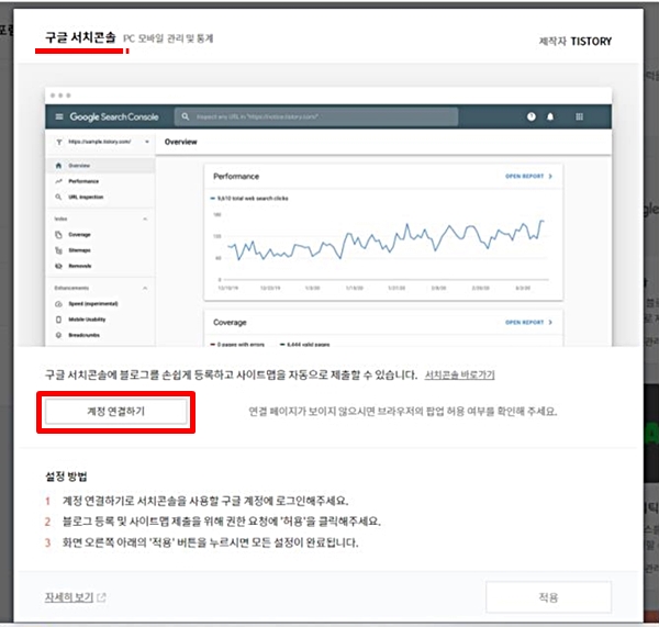 새창의 중간에 '계정 연결하기'가 보입니다. 이 버튼을 눌러주시면 잠시 후 연결이 되었다는 메세지가 뜹니다. '확인'을 눌러 창을 없애주시면 '적용'이 아래쪽에 활성화 되어 있습니다. 눌러주시면 끝!
