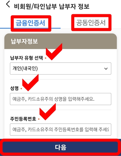 금융인증서 혹은 공동인증서를 선택 후 체크사항들을 적으신 후 '다음'