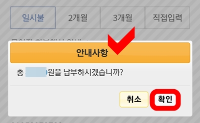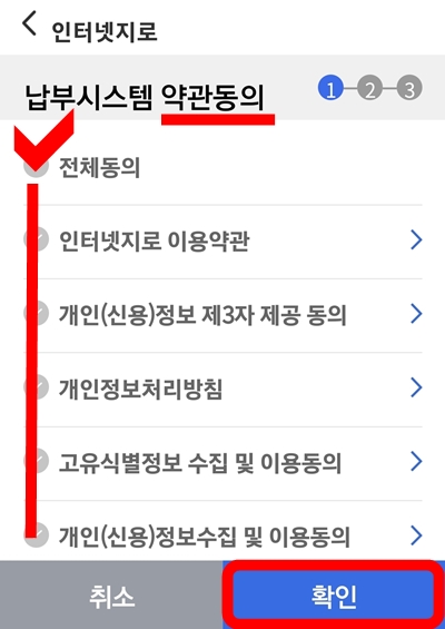 납부시스템 약관동의를 해야 합니다. '전체동의' 클릭 후 확인